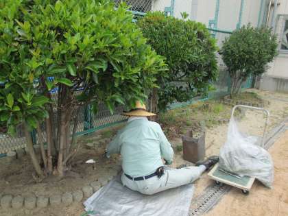 気温が高くなり、植物の成長が早くなってきました。先日から管理作業員が木々の剪定をしています。同時に、雑草抜きも順次進めています。子どもたちが少しでも気持ちよく過ごすことができるように環境整備をしています。