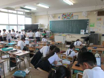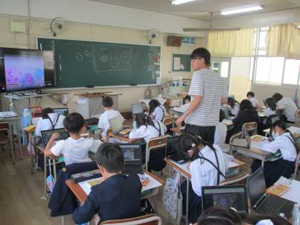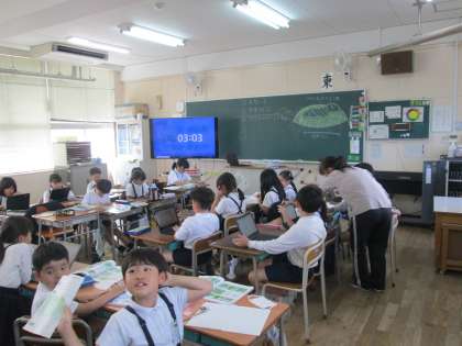 理科では、アゲハチョウの幼虫のスケッチをしました。観察をしたことをワークシートに書き記して、終わった児童はデジタルドリルで学習したことを復習しました。