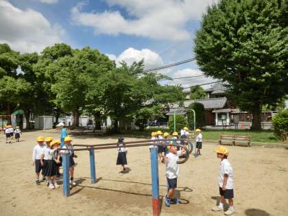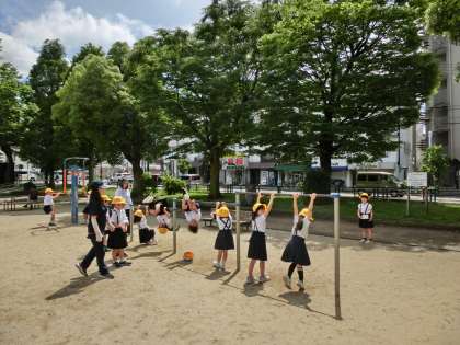 1年生が新佃公園へ公園たんけんに行きました。鬼遊びをして走り回ったり、いろいろな遊具で遊んだりしました。学校にはない遊具でとっても楽しそうです!!