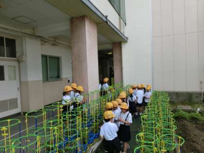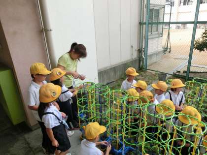 1年生がアサガオの花に肥料をあげました。毎日欠かさず水やりもしています。みんなの思いは1つ…「もっともっと大きくなって、きれいな花が咲きますように!!」