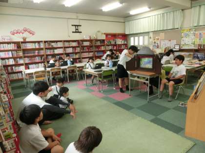 図書室では、個人で本を読んだり、自分たちで絵本や紙芝居の読み聞かせをしたりして本に親しんでいました。