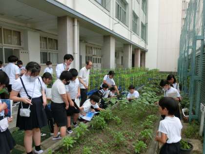 理科では、学習園で植物の観察をしました。どれぐらい伸びたのか測っている児童もいて、喜んでいました。