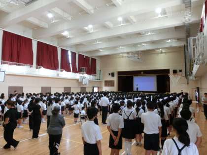 第1学期終業式をしました。校長先生からは夏休みに取り組んでほしいことについてお話がありました。生活指導の先生からは、夏休みのくらし「か」「き」「ご」「お」「り」についてお話がありました。