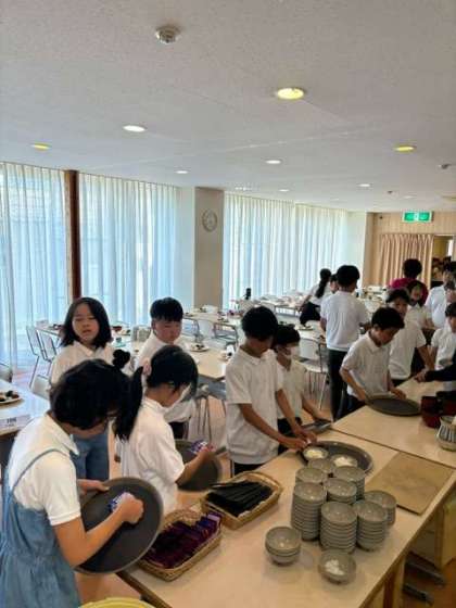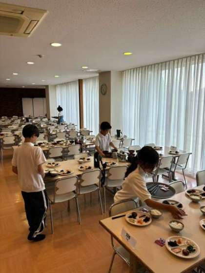 食事係さんがみんなより少し早く食堂に来て、先に配膳をしてくれました。テキパキ!!