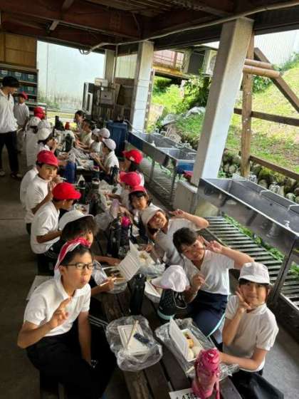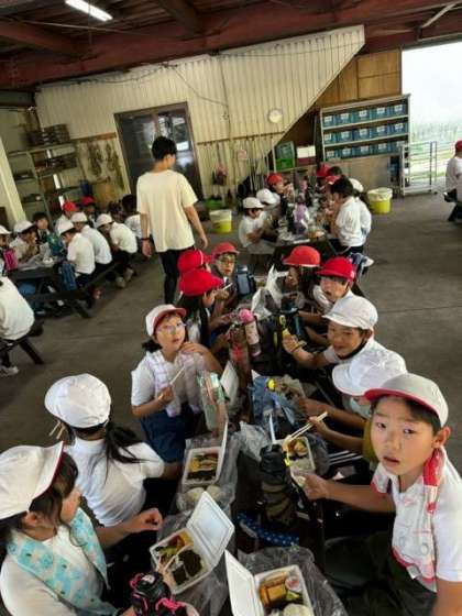 続いて、朝に作ったお弁当を食べました。おかずはみんな一緒だけど、一人一人が盛り付けたのでちがうものを食べてる感じがします!!