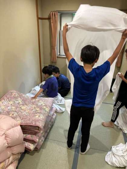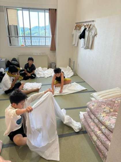 朝起きて、朝の準備や布団の片付けをしました。またあとで片付けの時間はありますが、すでに始めるなんてすごいですね!!