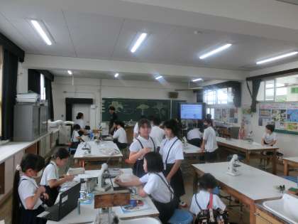 理科では、ヘチマの雌花と雄花のつくりを観察しました。顕微鏡で花粉も見て、みんな大驚き!!