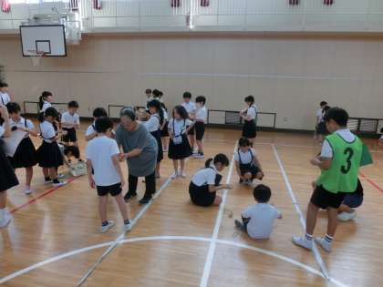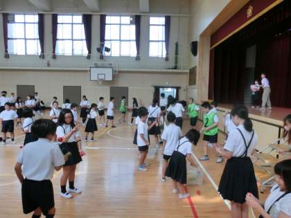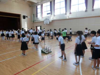 講堂では、輪投げ、コマ回し、けん玉、だるま落としなどで遊びました。コツを教え合っていて、とてもよい雰囲気でした。