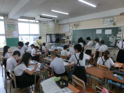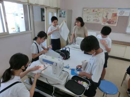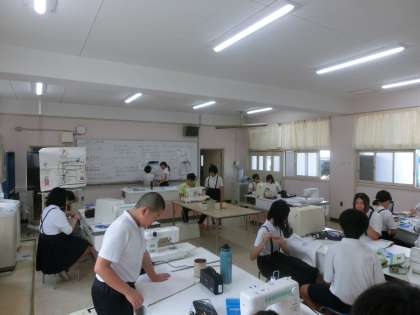 家庭科では、ナップザックづくりをしました。生地が分厚く、しつけ縫いをするのにも力が必要でたいへんです。作業が早く終わったら友達を教えていました。ミニ先生になってくれると、みんなとても助かります!!