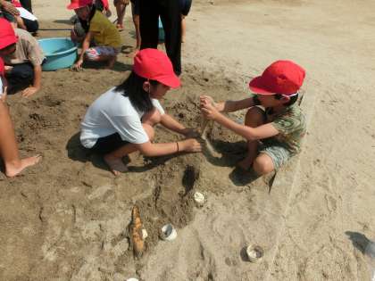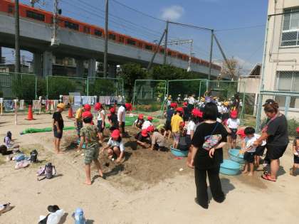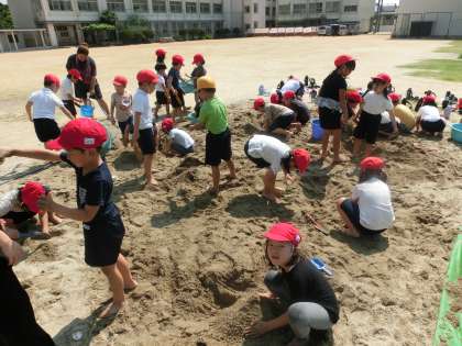 1年生が生活科「どろんこ遊び」の学習をしました。深い穴を掘ったり、お山を作ったり、トンネルを掘ったりして楽しみました。水はけが良すぎて穴に水が溜まらなかったのは残念でしたが、みんななかなかのなかなかの力作でした!!