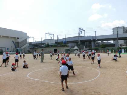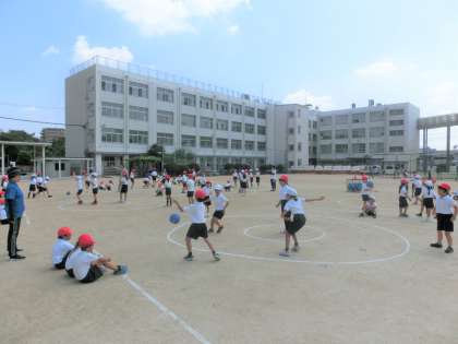 2年生が体育科「ボールゲーム」をしました。ドーナツ型のコート外からコートの中心にいる味方にパスを通すと点が入ります。相手チームに邪魔されないように、コート外の友だちにパスをして、得点をねらいました。