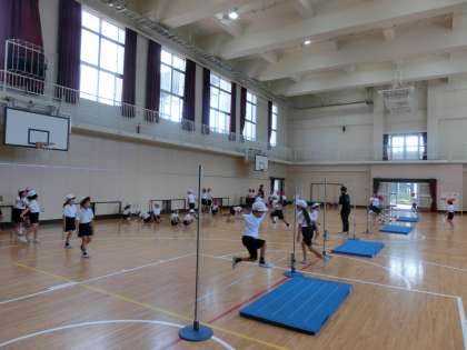 講堂では、「走・跳の運動遊び」をしました。いろいろな高さのゴムを跳び越えました。
