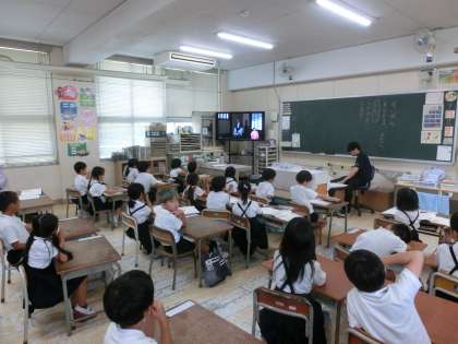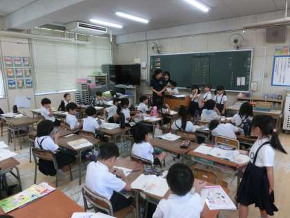 国語科「かいがら」の学習では、登場人物を確認しました。また、本物の貝殻を実際に耳に当ててみて、音が聴こえるか確認しました。みんな興味津々…。