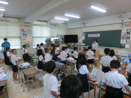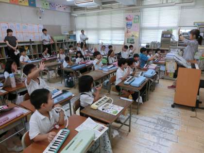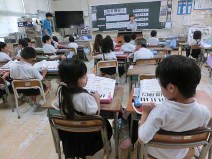 1年生が音楽科の学習をしました。鍵盤ハーモニカを使って「どんぐりさんのおうち」を演奏しました。音楽に合わせて「ド」と「ソ」を長い音や短い音で吹きました。自分たちで考えたリズムを演奏したり、それを全員が真似たりして学習を進めました。