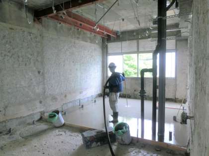 1階から4階までの工事中のトイレに、コンクリートが運び込まれました。床の部分を新しく固めたようです。解体作業も終わり、いよいよ本格的に作る工程に入るようです。
