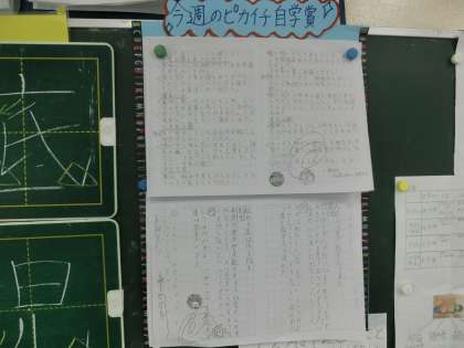 また、教室の後ろの黒板に「今週のピカイチ自学賞」がありました。自分で計画を立てて取り組む自主学習。友達のも参考にして、取り組みましょうね!!