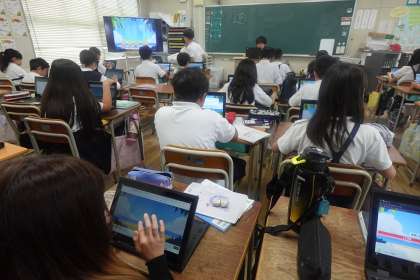 理科では、学習したことを「Kahoot」のアプリ使って復習しました。「Kahoot」は教員が作ったクイズを4択や〇×で答えます。