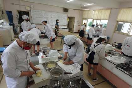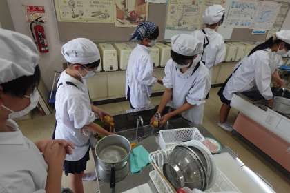 6年生が家庭科の調理実習で「ジャーマンポテト」を作りました。じゃがいもをまずは茹でて、その後ベーコンと一緒に炒めました。「ゆでる」「いためる」の両方をするので忙しいですね!!