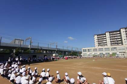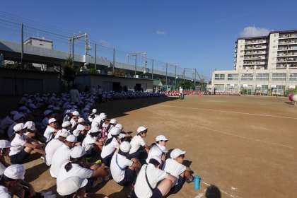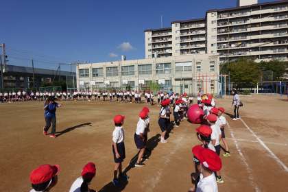 全児童が運動場に集まり、運動会の1回目の全体練習をしました。全校競技(大玉送り)の練習です。1回戦は1・3・5年生、2回戦は2・4・6年生で取り組みます。1〜4年生は大玉を転がしますが、5・6年生は頭の上を通します。本番は紅白どちらが勝つかな?