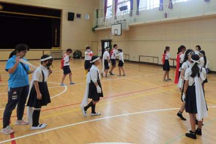 応援団が講堂に集まって、タスキや手袋、鉢巻をつけました。身につけるとやっぱり一段と気合が入るようです。あちらこちらで赤白関係なく自主練習を始めていました!!本番は3日後です!!