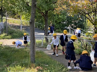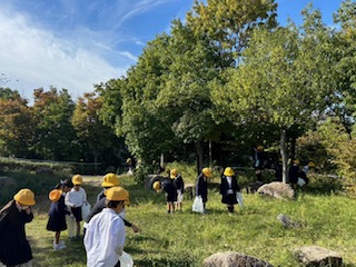 紅葉した落ち葉を探しています。見つけたどんぐりで何を作るのか、楽しみですね。