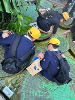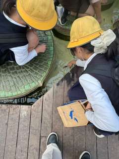 ドクターフィッシュの池に手をつけて喜んでいる子ども達