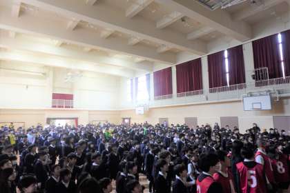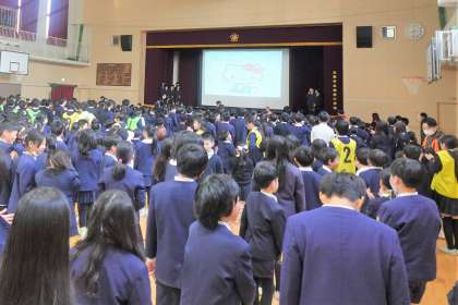 今日の集会は「キャラクターあてクイズ」でした。集会委員の作った発表を見て、何のキャラクターかをあてます。あたったときには大歓声!!大盛り上がりでした!!