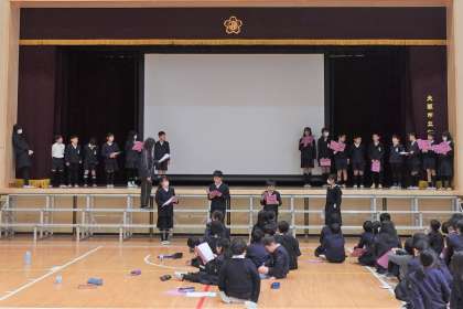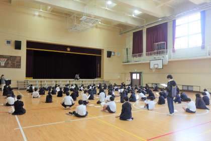 学習練習に向けて、各学年が講堂で練習をしています。並び方、セリフ、動きなど、確認することがたくさん…1つずつ覚えていきましょうね!!