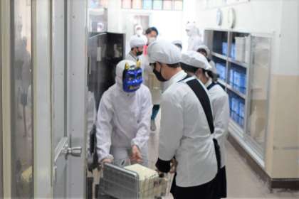 今日の給食は節分の献立です。そのためか給食室には鬼が出現しました!!赤鬼や青鬼が給食を配ってくれました。優しい鬼さんです!!