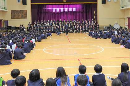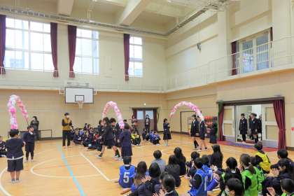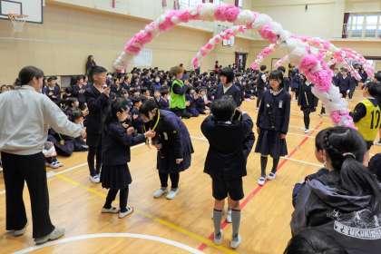 6年生の卒業をみんなでお祝いしました。卒業生が笑顔で入場し、2年生からメダルをもらいました。