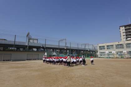 先日の雨の影響か少し肌寒い様子の本日でしたが、1年生は、体育の学習を運動場で取り組みました。