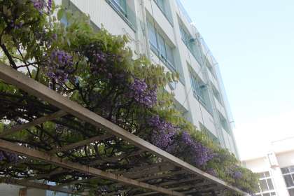 運動場のそばにある藤棚では、藤の花がきれいに咲いている時季となりました。
