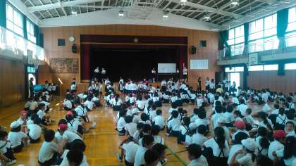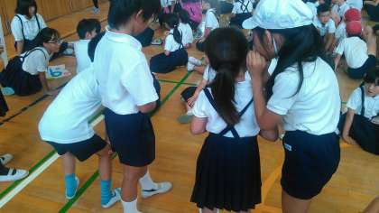 朝の児童集会で、伝言ゲームをしました。各班の最後の人から発表してもらった答えは、班ごとに違って、大爆笑でした。