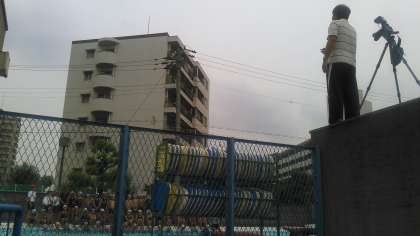 水泳学習の場面を撮影しているところです。みんな笑顔で「ハイチーズ」