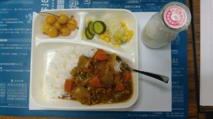 10月18日(火)今日はカレーライスと野菜サラダ、さくらんぼです。1・2年生は、お弁当を持って遠足です。子どもたちは、両方食べたいのではないかと思います。