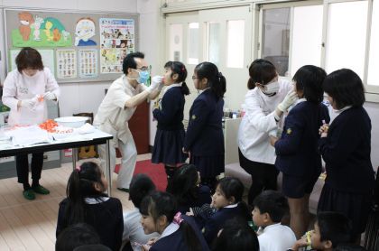 虫歯になりにくい歯にするため、4年生がフッ化物を歯に塗布しました。はじめに各教室で正しい歯みがきの仕方を教えていただいた後、きれいに歯をみがき、塗布の準備をしました。次に保健室で歯科校医の先生に塗布用の器具をつけてもらいました。器具を口に入れたまましばらくはそのままでがまんです。