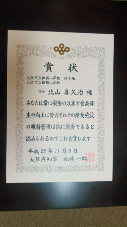 12月5日(月)給食室の衛生管理と栄養の改善に努めたということで大阪府より表彰をしていただきました。これは、およそ30年ぶりのことです。