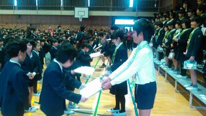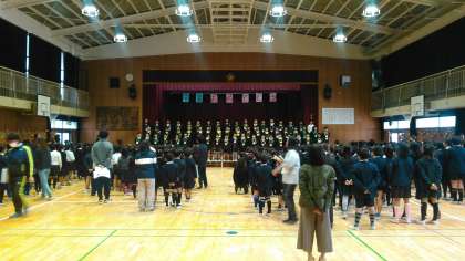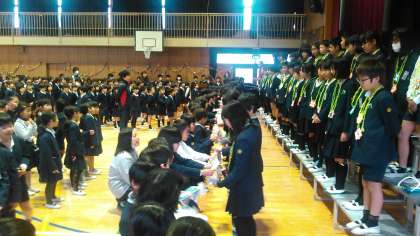 卒業生入場のあと、在校生からメダルを首にかけてもらった後、プレゼント交換をしました。