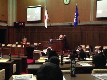 社会科の学習の一つとして、6年生が谷町にある大阪府庁とピース大阪に行きました。府庁では、府庁内部を見学させてもらったあと、議場に入りました。そこで「キッズ大阪府議会」の活動で、模擬議会を体験しました。議事の提案や採決などを行いました。