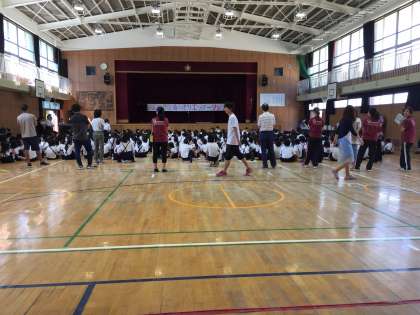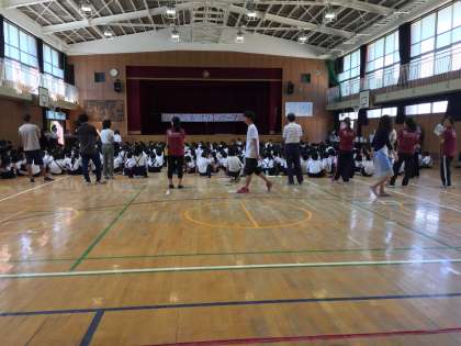講堂に集まって、児童会子どもたちの司会でオープニングが進んでいます。
