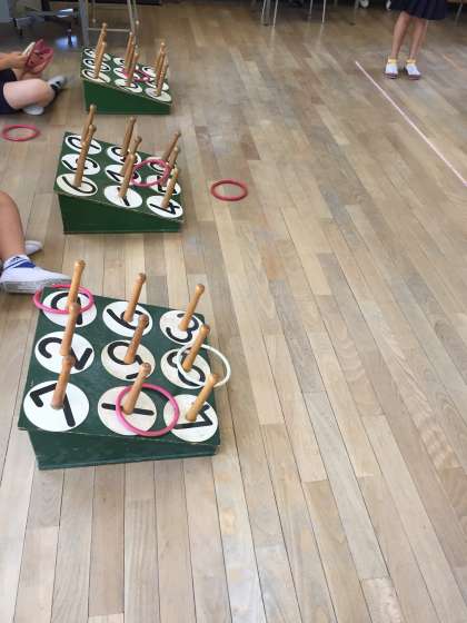 わなげのお店です。しっかり説明を聞いて、高得点目指して投げています。