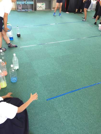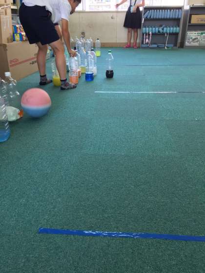 低学年、中学年、高学年で距離が変わっています。工夫していますね。なかなか倒れません。