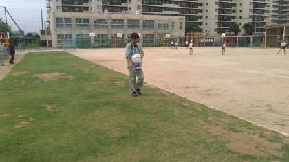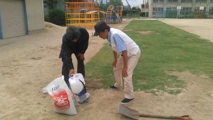 芝刈り機のエンジンをかけ、初めて刈りました。育ちが悪かったり子どもたちがよく通るところの芝生を移植したりもしました。そのあと肥料をまいて終了です。