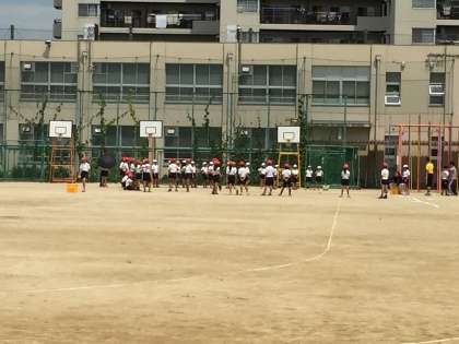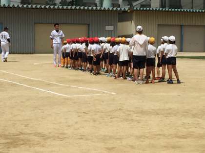 7月11日(火)3年生の子どもたちは、オリックスの方々と一緒に運動場で野球をして汗を流しています。炎天下の下でも、元気に体を動かして楽しんでいました。