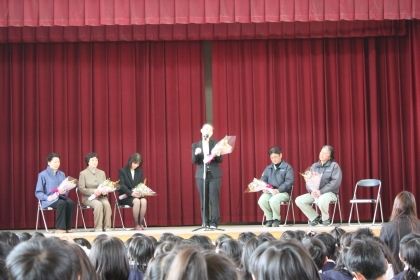 3月末で退職または他の学校へ転勤される教職員と児童とのお別れの式をしました。児童代表がお別れのことばを述べ、教職員の方々に花束を渡しました。転退職される教職員は、別れの挨拶の後、児童の間と花アーチをくぐって退場しました。