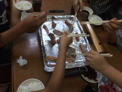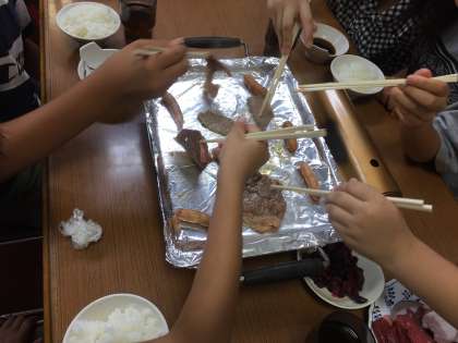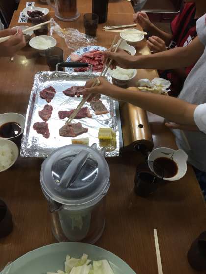 お楽しみの焼肉が始まりました。具材の並べ方も班によってそれぞれですね。