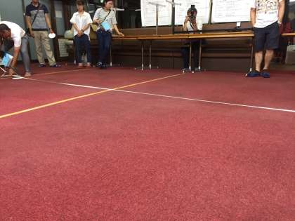 第1種目、円盤投げが始まりました。現在の最高記録は、640センチメートルです。