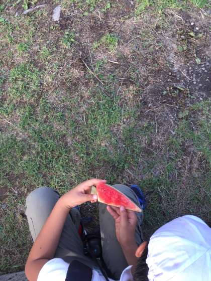 下山後のご褒美、スイカの時間です。恒例の種飛ばしもしていました。