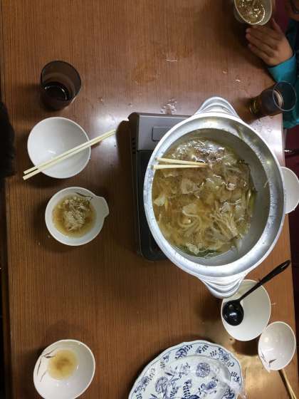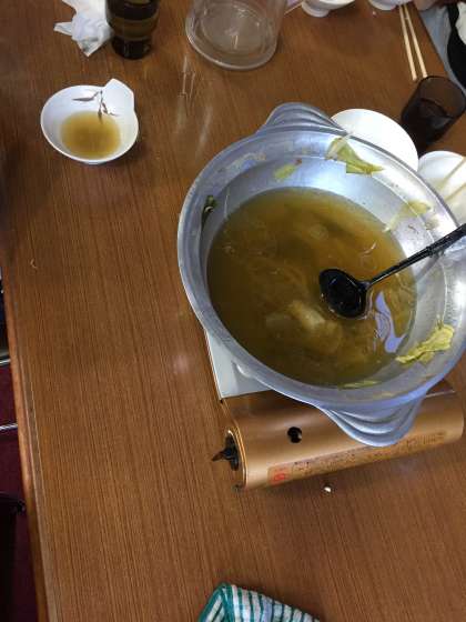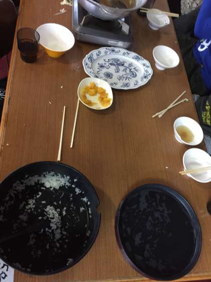 最後の夕食 カモ鍋をみんなで美味しくいただきました。ご飯も鍋もお茶もたくさんたくさんいただきました。