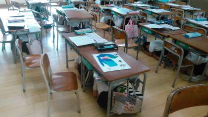 9月5日(火)午前11時から訓練を行いました。1年生の教室では、机の下にもぐった子どもたちがよく見えないくらい上手に避難していました。